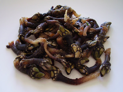 2. Ferve na água do mar o alho, o louro e o piripiri. Quando começar a ferver introduz os perceves e deixa levantar fervura outra vez (sempre em lume forte) e tira-os imediatamente.
